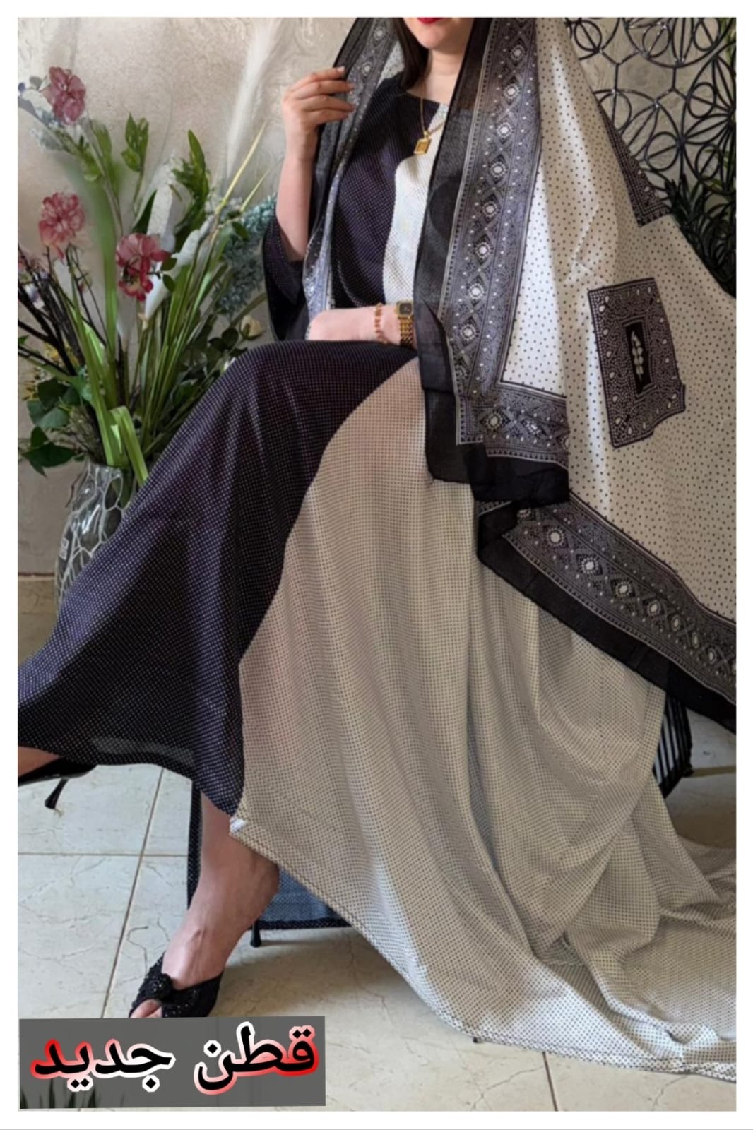 ثوب أبيض وأسود مصنوع من القطن بتصميم جميل مطبوع عليه شيلة متناسقة مخيطة على الطراز الظفاري