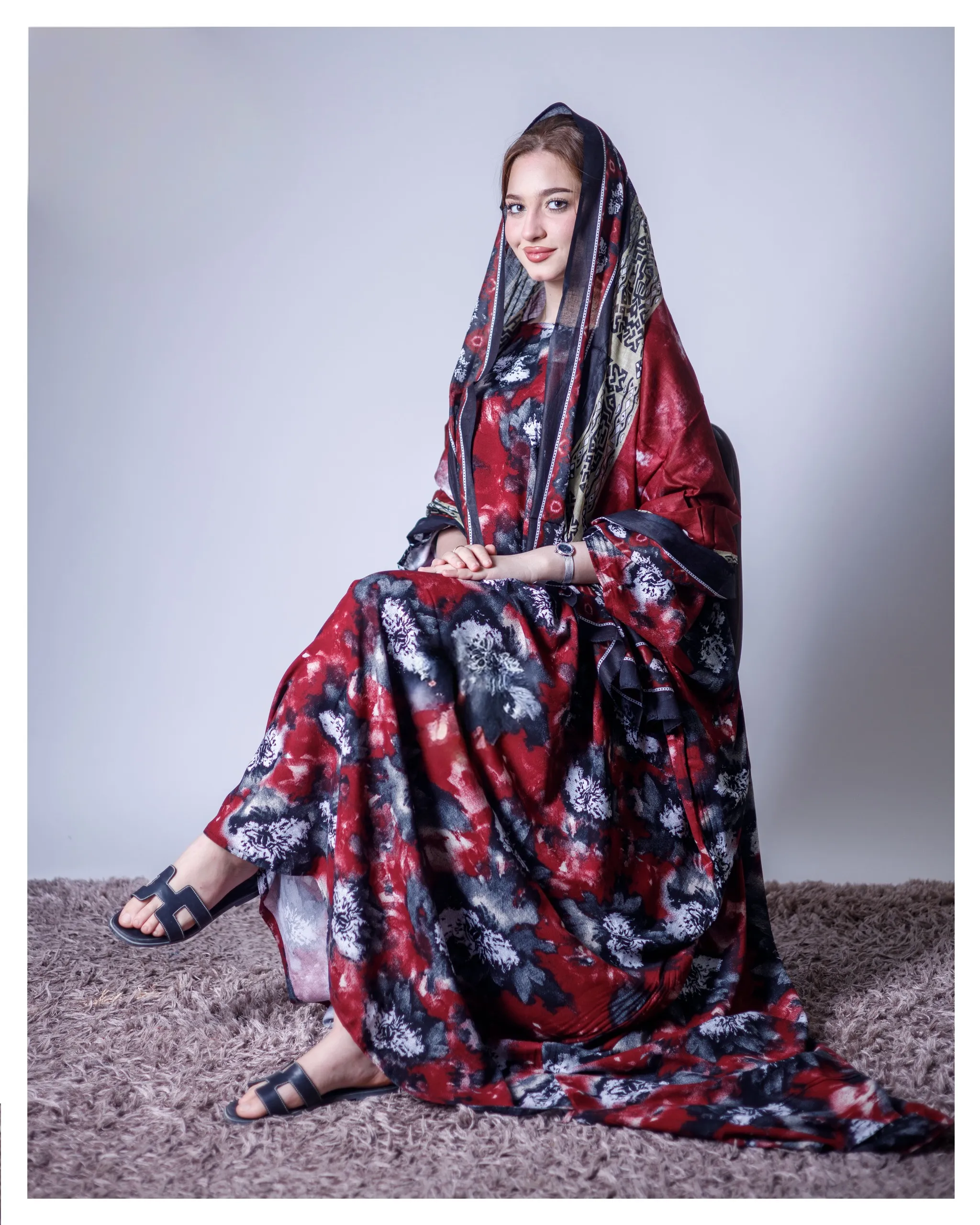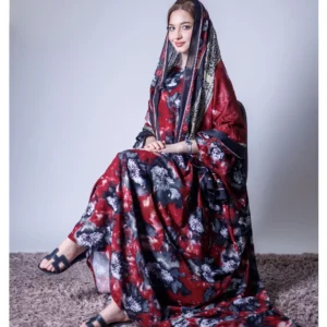 ثوب أحمر اللون مصنوع من القطن بتصميم جميل مطبوع عليه شيلة مطابقة مخيطة على الطراز الظفاري