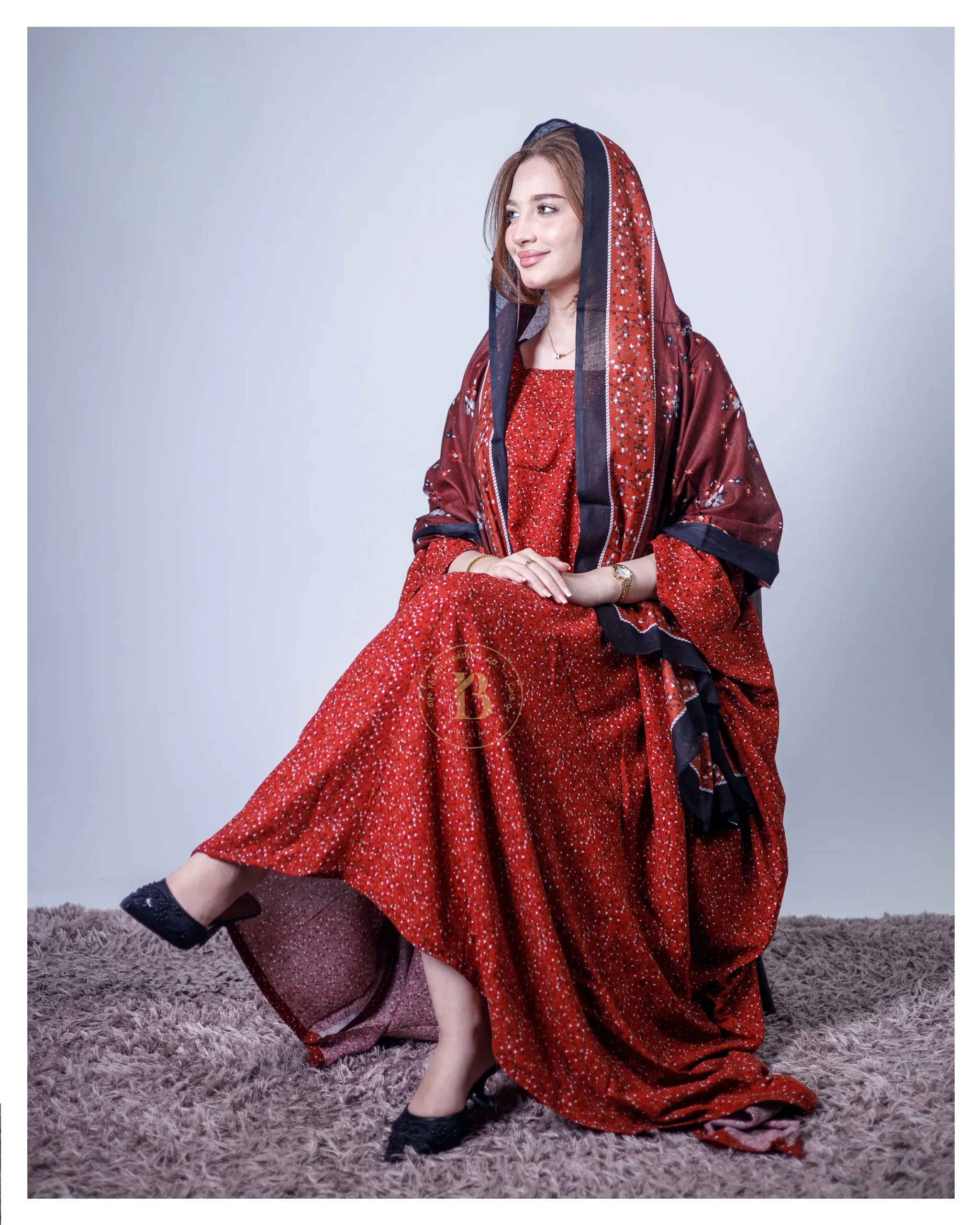 ثوب أحمر اللون مصنوع من القطن بتصميم جميل مطبوع عليه شيلة متناسقة مخيطة على الطراز الظفاري