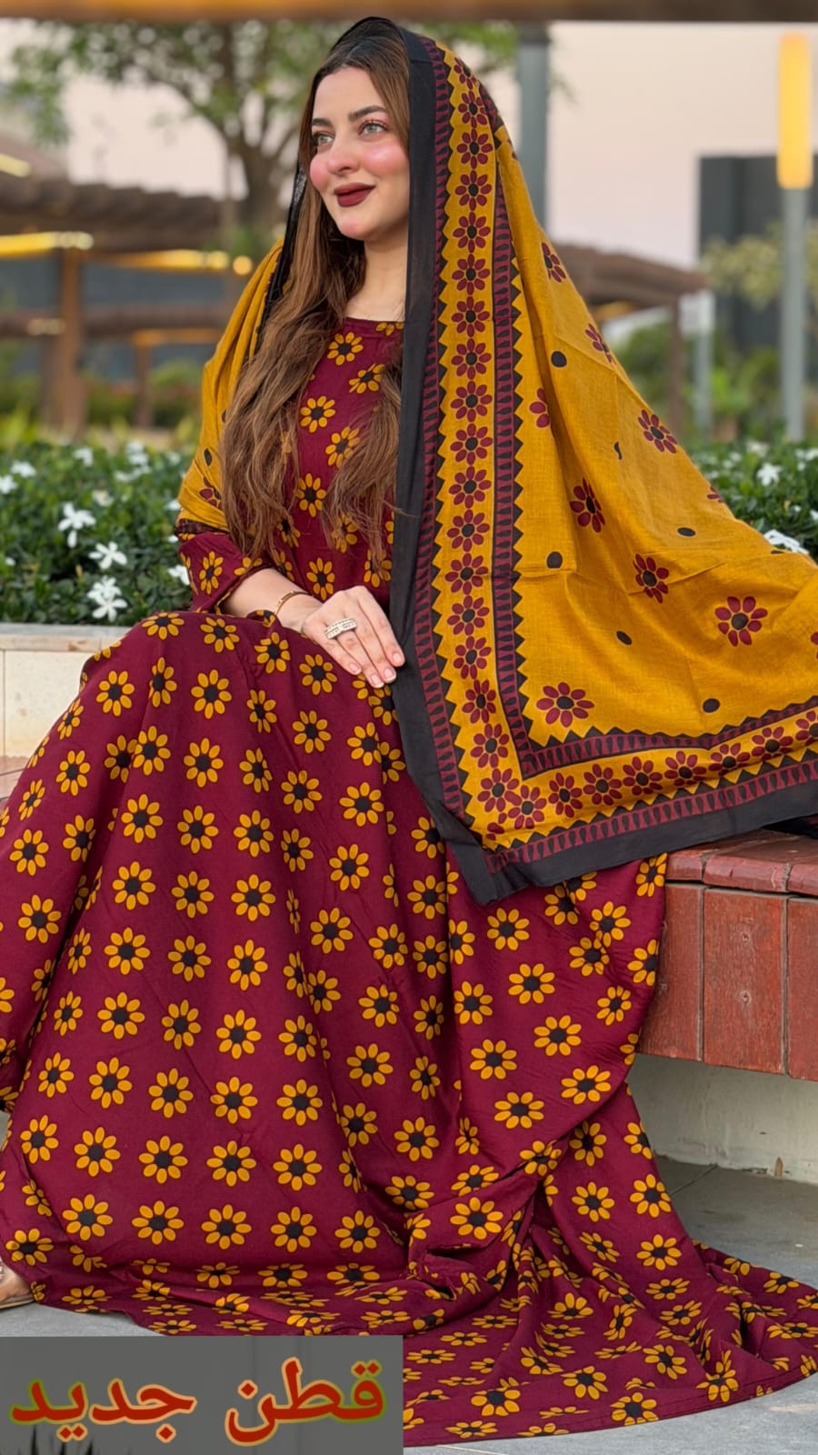 ثوب أحمر اللون مصنوع من القطن مع تصميم زهور جميل مطبوع ومزين بشيلة متناسقة مخيطة على الطراز الظفاري