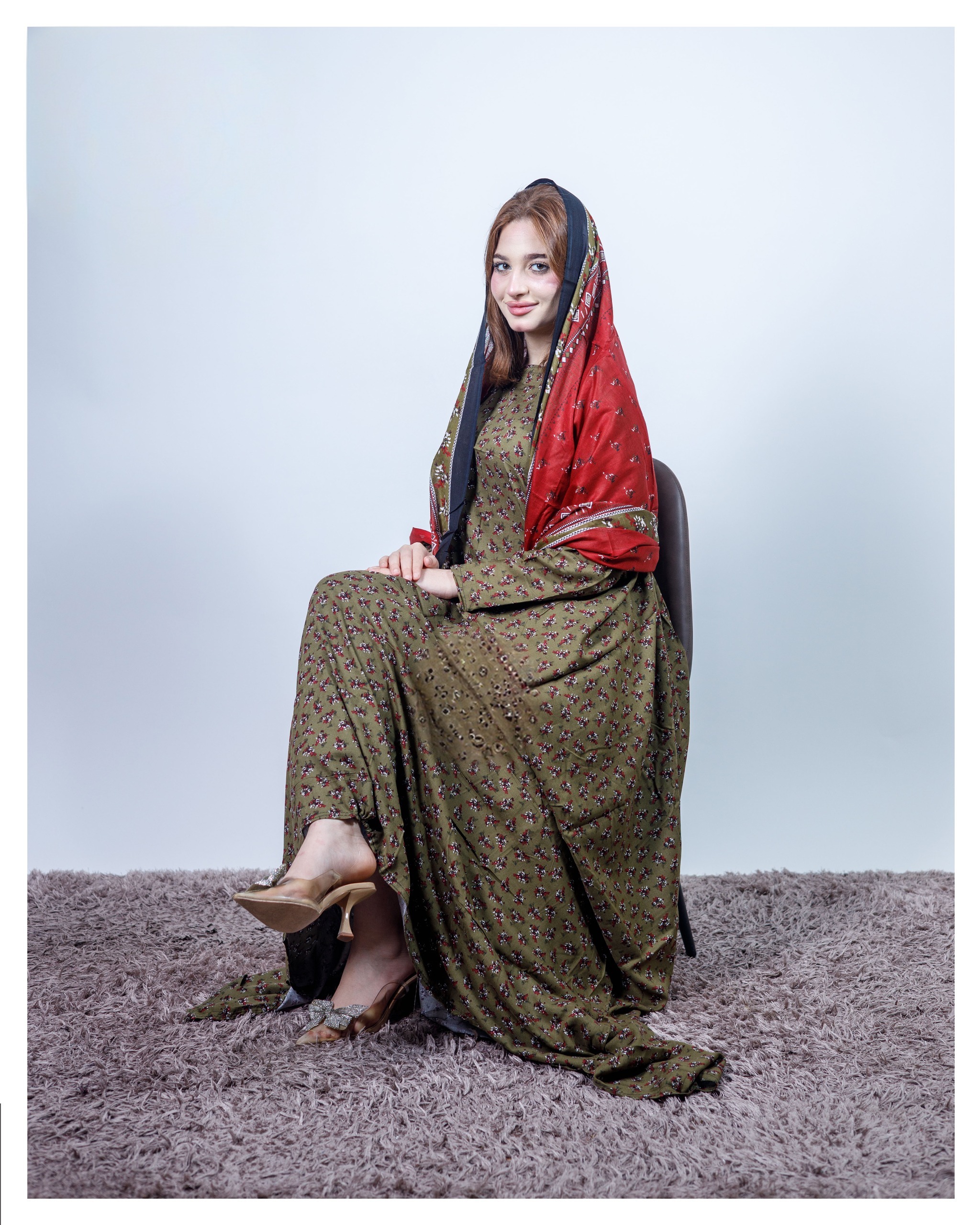 ثوب أخضر اللون مصنوع من القطن بتصميم جميل مطبوع عليه شيلة متناسقة مخيطة على الطراز الظفاري