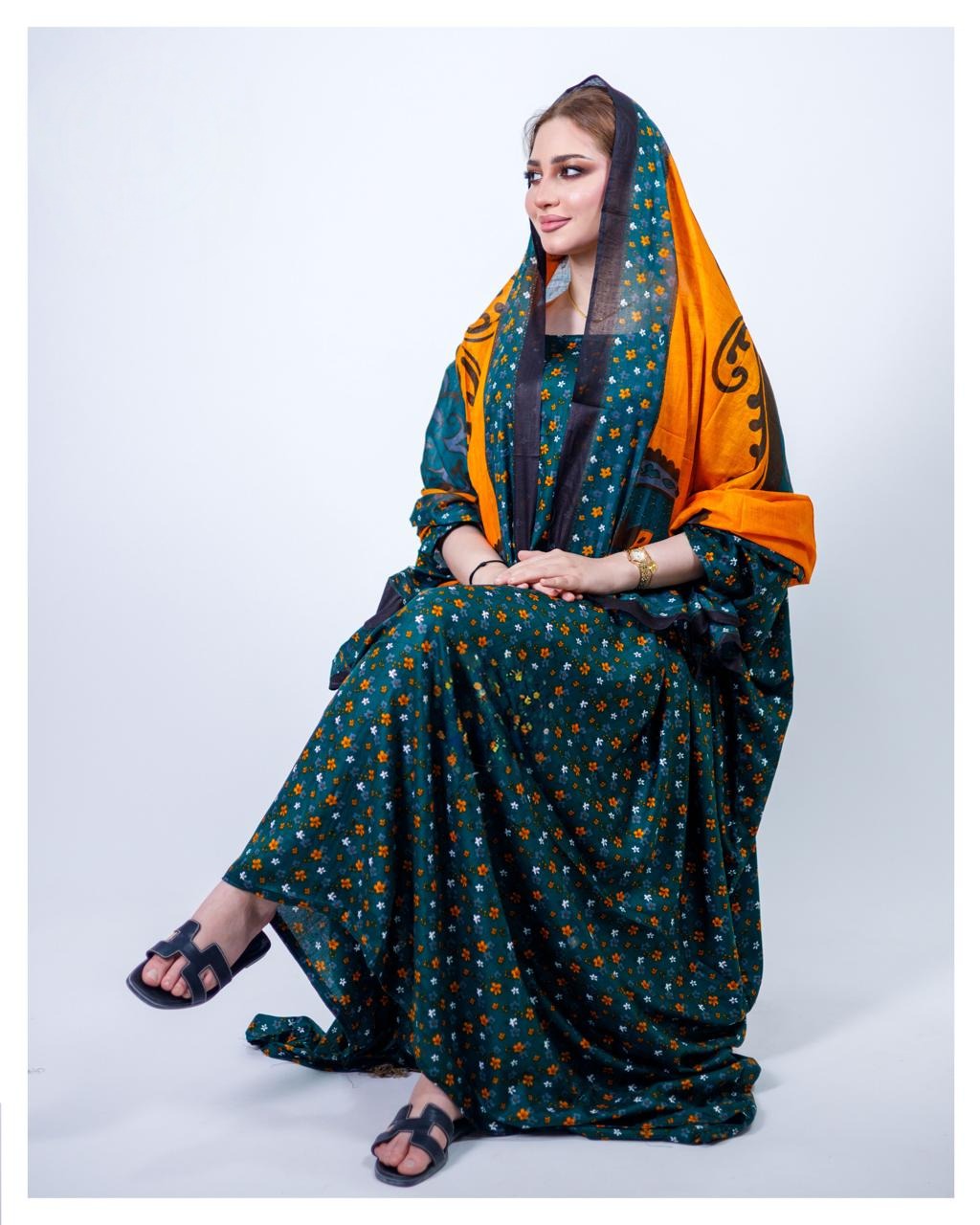 ثوب أخضر اللون مصنوع من القطن بتصميم جميل مطبوع عليه شيلة متناسقة مخيطة على الطراز الظفاري