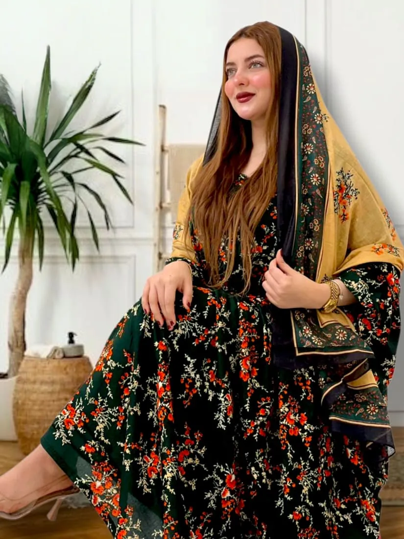 ثوب أخضر اللون مصنوع من القطن بتصميم جميل مطبوع عليه شيله مطابق مخيط على طراز الظفاري