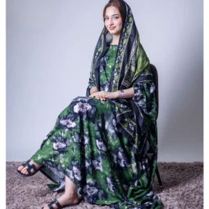 ثوب أخضر اللون مصنوع من القطن بتصميم جميل مطبوع عليه شيلة متناسقة مخيطة على الطراز الظفري