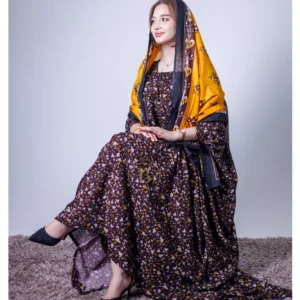 ثوب أرجواني اللون مصنوع من القطن، مزين بنقشة زهور جميلة، مع شيلة متناسقة، ومخيط على الطراز الظفاري