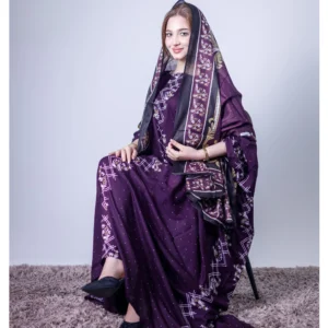 ثوب أرجواني اللون مصنوع من القطن بتصميم جميل مطبوع عليه شيلة متناسقة مخيطة على الطراز الظفاري