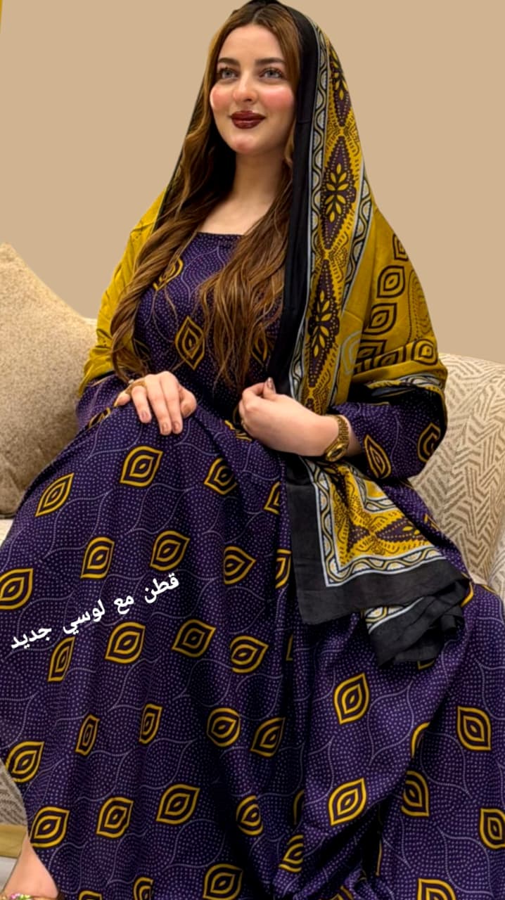 ثوب أرجواني اللون مصنوع من القطن بتصميم جميل مطبوع، مزود بشيلة مطابقة مخيط على الطراز الظفاري