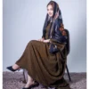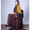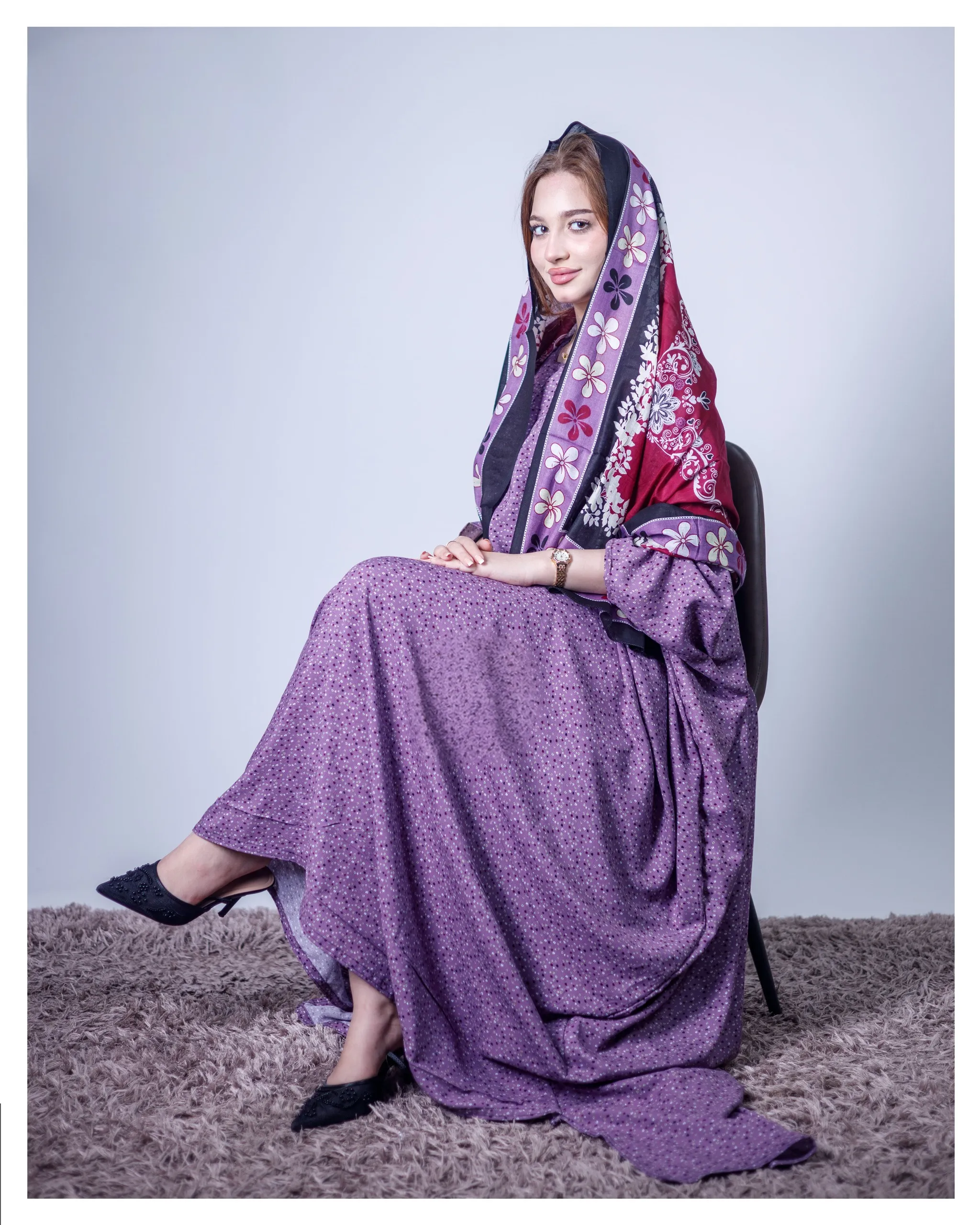 ثوب أرجواني اللون مصنوع من القطن بنقشة بولكا مطبوعة مع شيلة مطابقة مخيطة على الطراز الظفاري