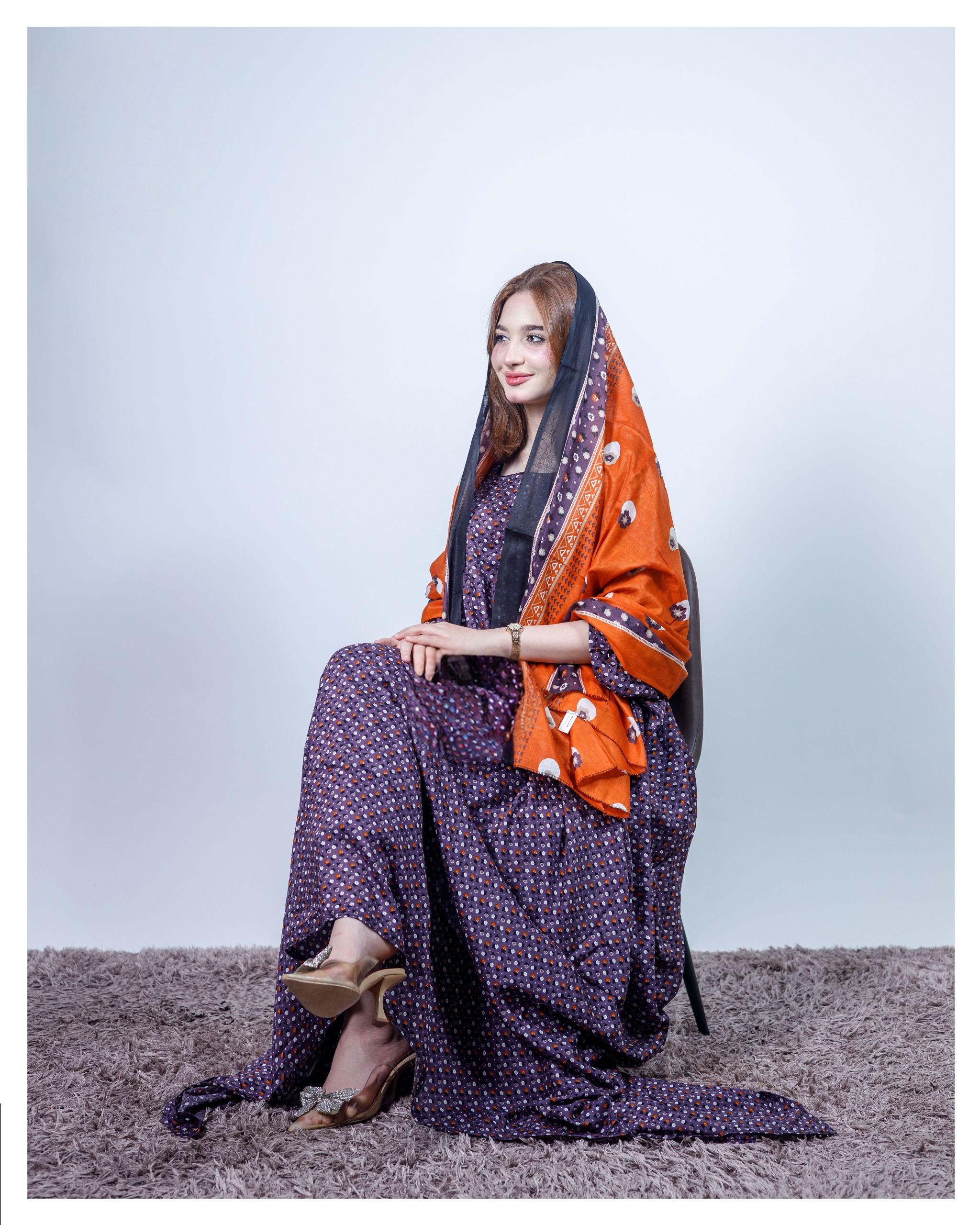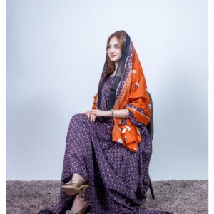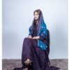 ثوب أرجواني اللون مصنوع من القطن مع تصميم زهور جميل مطبوع ومزين بشيلة متناسقة مخيطة على الطراز الظفاري