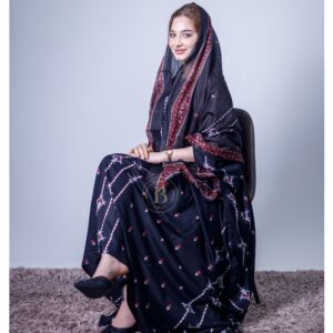 ثوب أزرق اللون مصنوع من القطن، مزين بتصميم جميل مطبوع عليه شيلة متناسقة، ومخيط على الطراز الظفاري