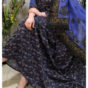ثوب أزرق اللون مصنوع من القطن بتصميم جميل مطبوع عليه شيلة متناسقة مخيطة على الطراز الظفاري