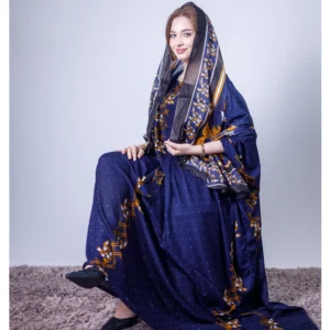 ثوب أزرق اللون مصنوع من القطن بتصميم جميل مطبوع عليه شيلة متناسقة مخيطة على الطراز الظفاري