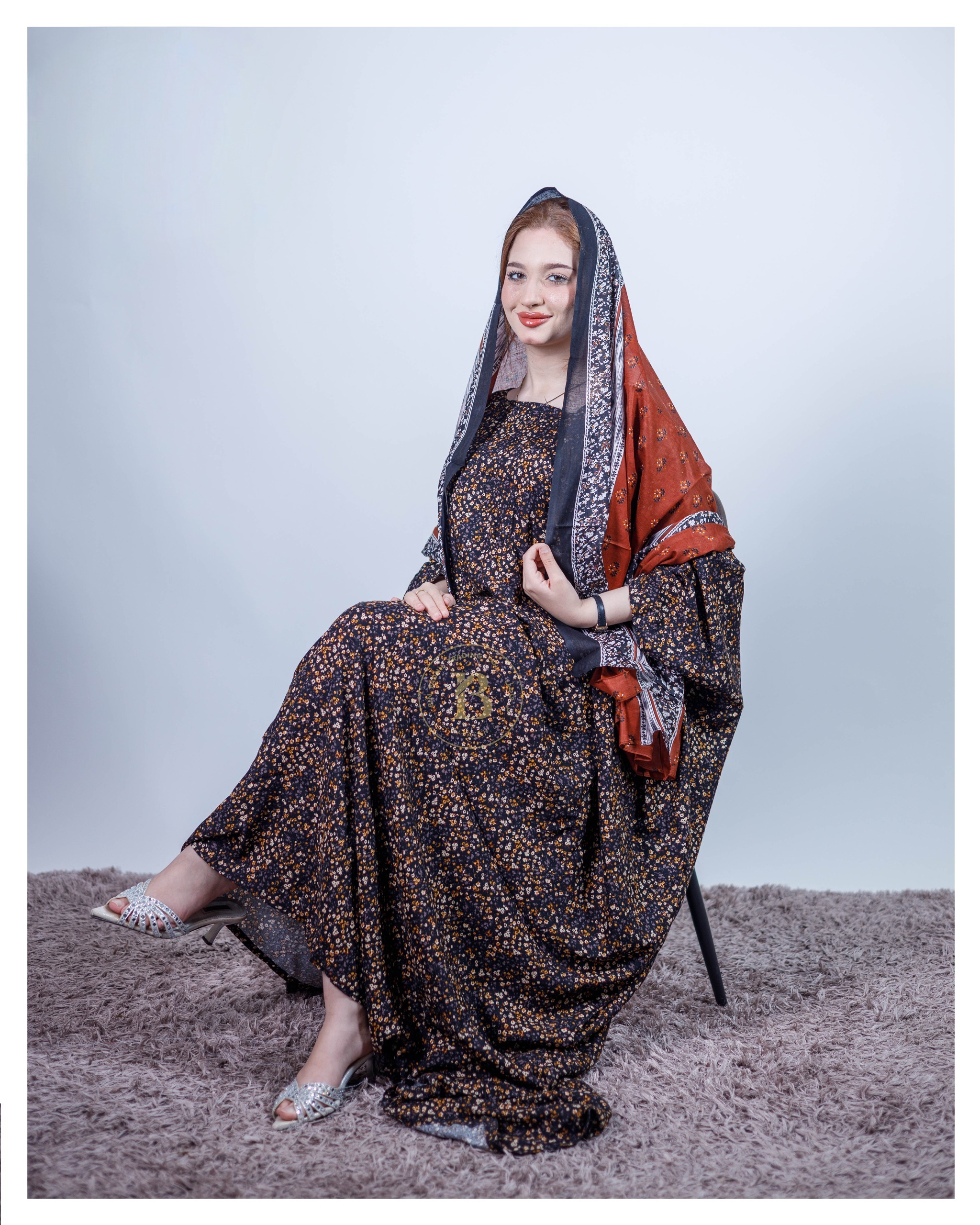 ثوب أزرق اللون مصنوع من القطن بتصميم زهور جميلة مطبوع عليه شيلة متناسقة مخيطة على الطراز الظفاري