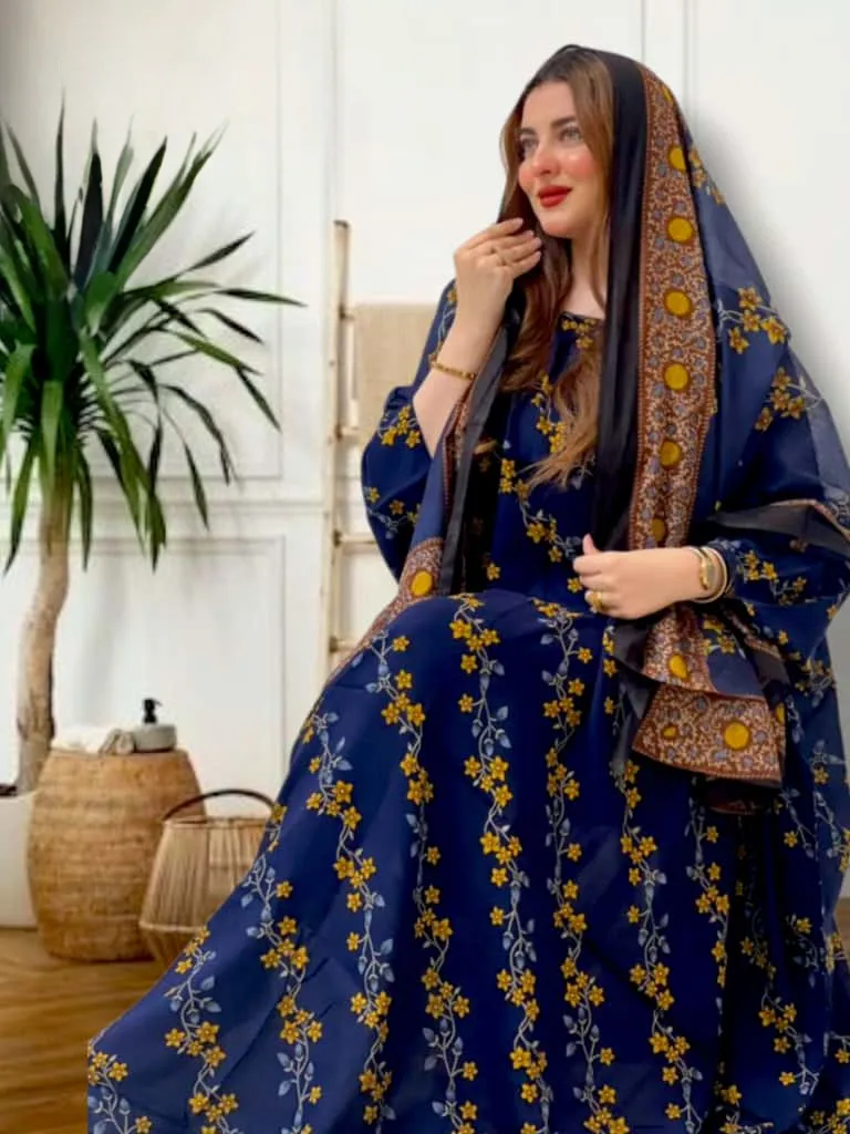ثوب أزرق اللون مصنوع من القطن مع تصميم زهور جميل مطبوع عليه وشيله مطابق مخيط على طراز الظفاري