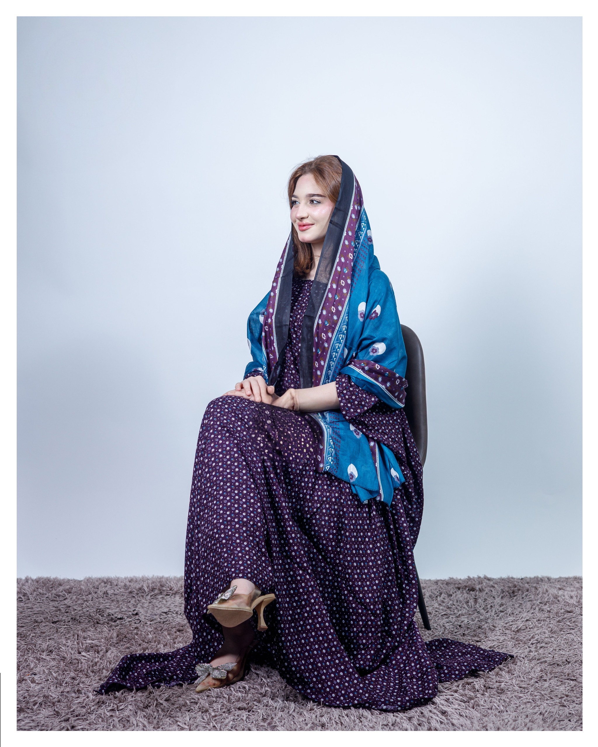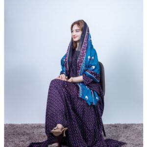ثوب أزرق اللون مصنوع من القطن مع تصميم زهور جميل مطبوع ومزين بشيلة متناسقة مخيطة على الطراز الظفاري