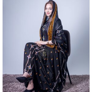 ثوب أسود اللون مصنوع من القطن، مزين بتصميم جميل مطبوع عليه شيلة متناسقة، ومخيط على الطراز الظفاري