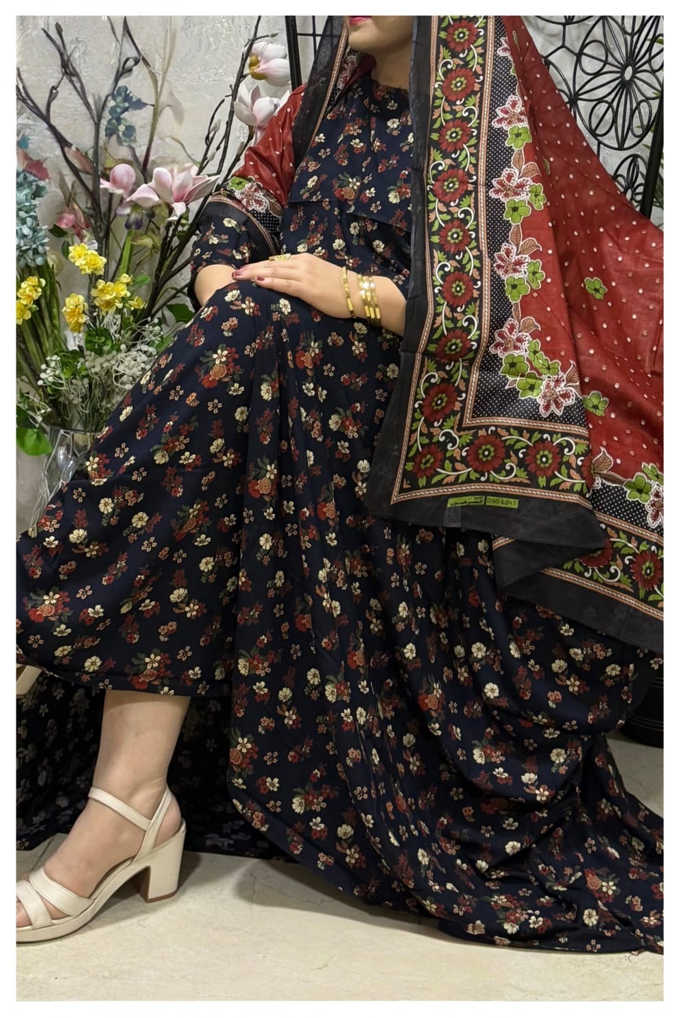 ثوب أسود اللون مصنوع من القطن الكويتي مع تصميم زهور جميل مطبوع مع شيلة مطابقة مخيطة على طراز ظفاري