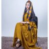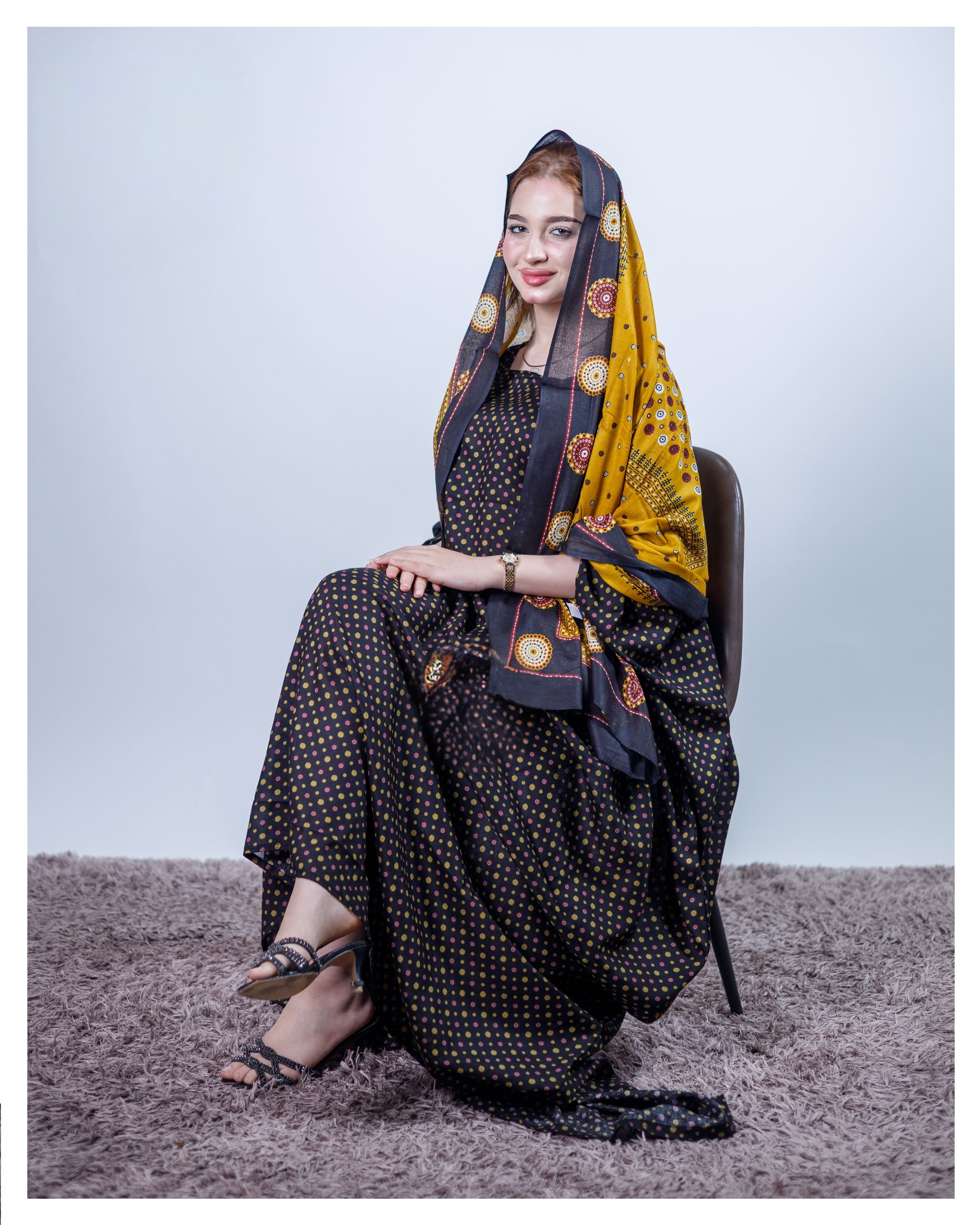 ثوب أسود اللون مصنوع من القطن بتصميم بولكا جميل مطبوع عليه شيلة متناسقة مخيطة على الطراز الظفاري، متوفر أيضًا بدون خياطة