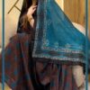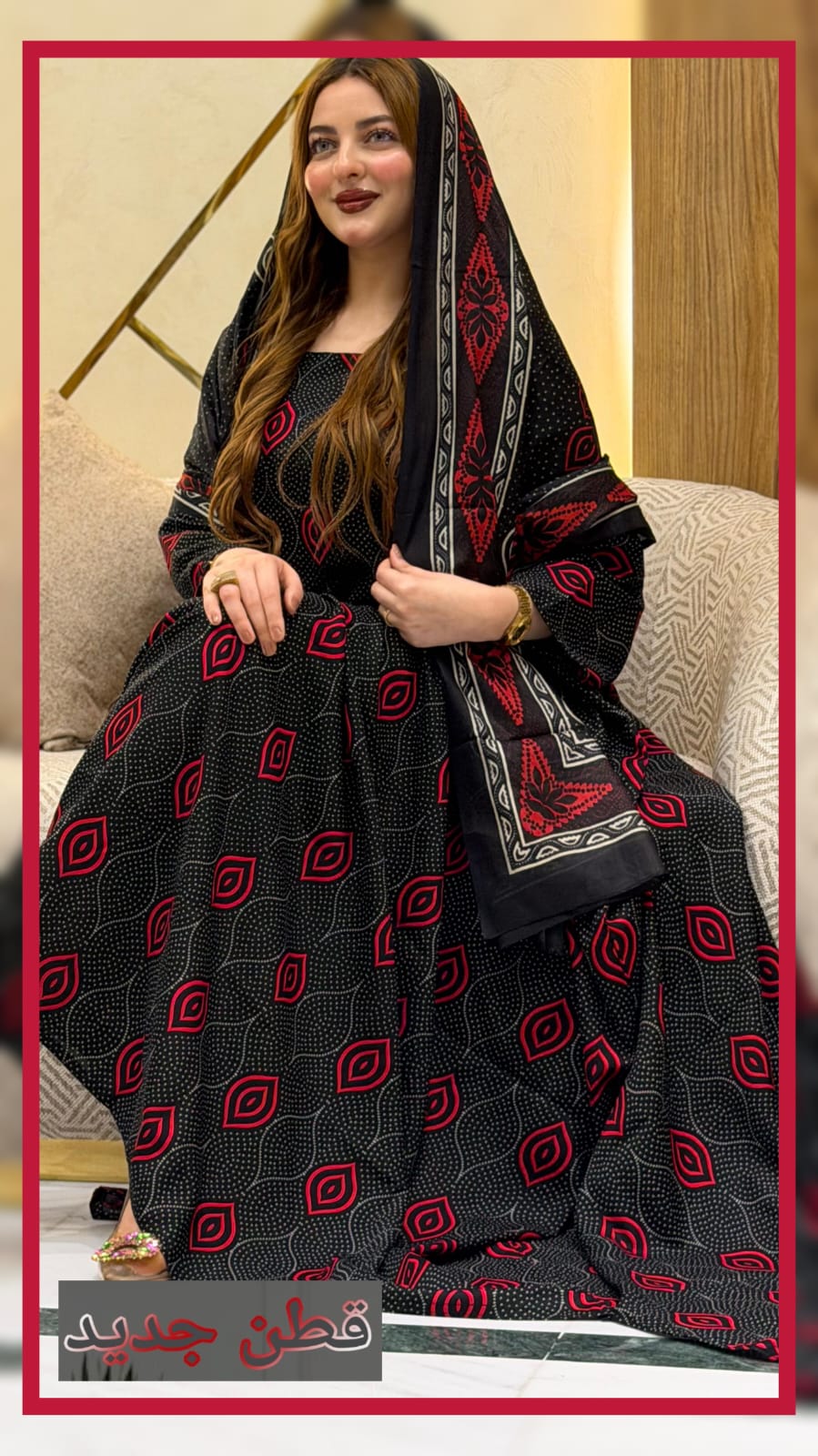 ثوب أسود اللون مصنوع من القطن بتصميم جميل مطبوع، مزود بشيلة مطابقة مخيط على الطراز الظفاري