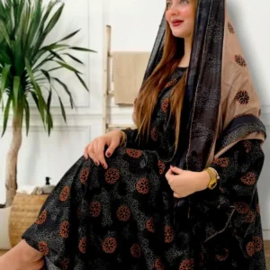 ثوب أسود اللون مصنوع من القطن بتصميم جميل مطبوع بشيلة متناسقة مخيطة على الطراز الظفاري