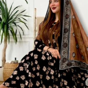 ثوب أسود اللون مصنوع من القطن مع تصميم زهور جميل مطبوع عليه وشيله مطابق مخيط على طراز ظفري
