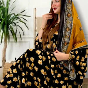 ثوب أسود اللون مصنوع من القطن مع تصميم زهور جميل مطبوع مع شيله مطابقة مخيطة على طراز ظفري