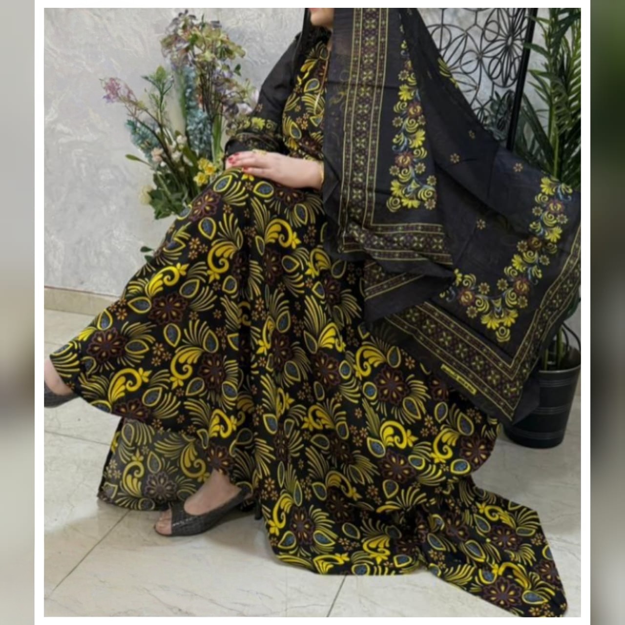 ثوب أسود اللون مصنوع من القطن مع تصميم زهور جميل مطبوع ومزين بشيلة متناسقة مخيطة على الطراز الظفاري