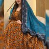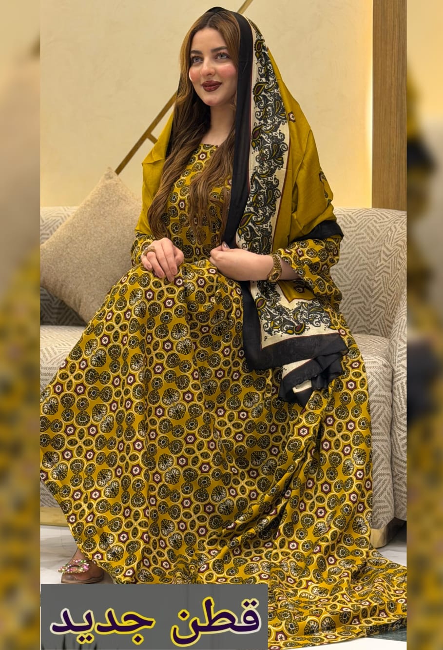 ثوب أصفر اللون مصنوع من القطن، مزين بنقوش جميلة ومزين بشيلة متناسقة مخيطة على الطراز الظفاري