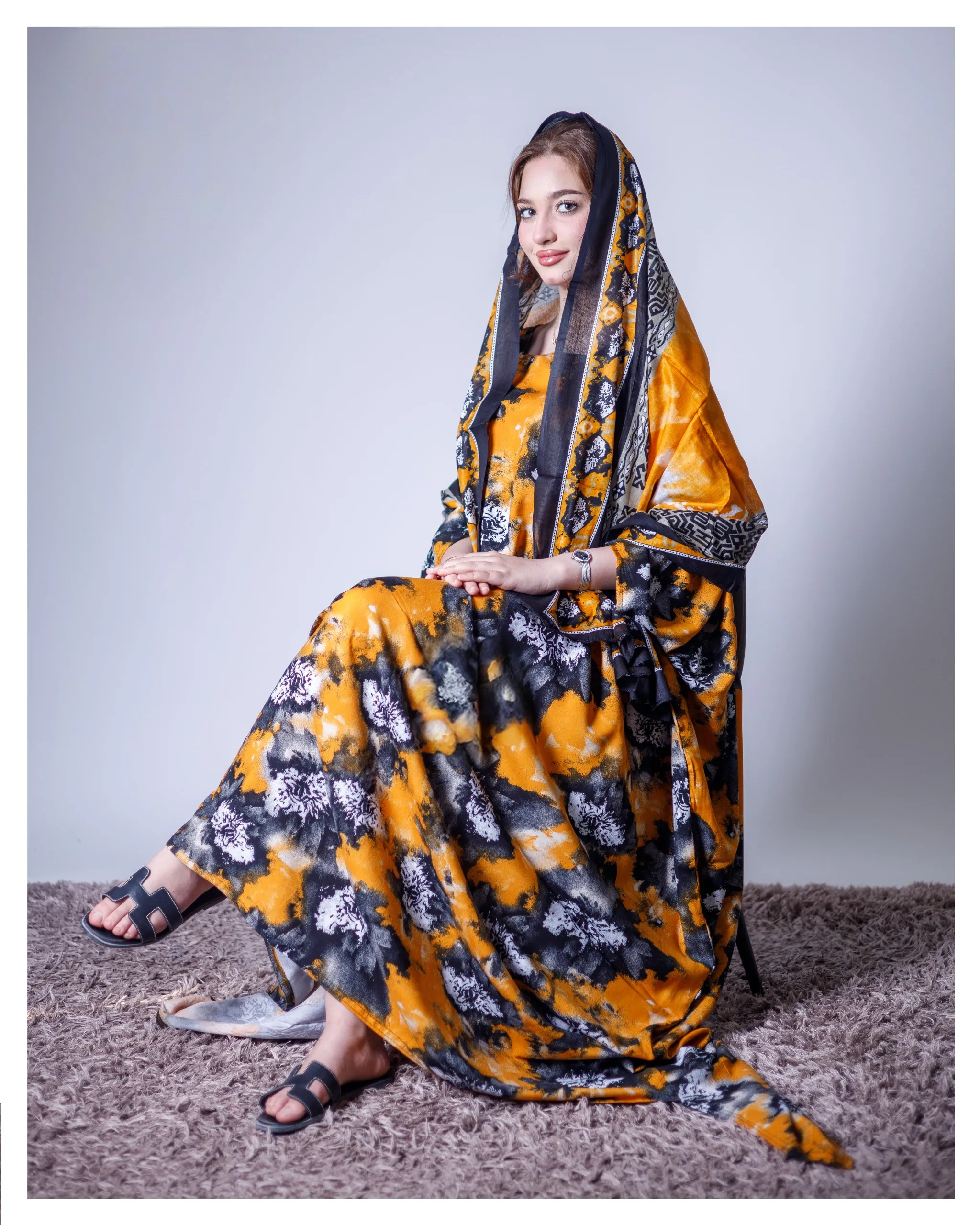 ثوب أصفر اللون مصنوع من القطن بتصميم جميل مطبوع عليه شيلة مطابقة مخيطة على الطراز الظفري