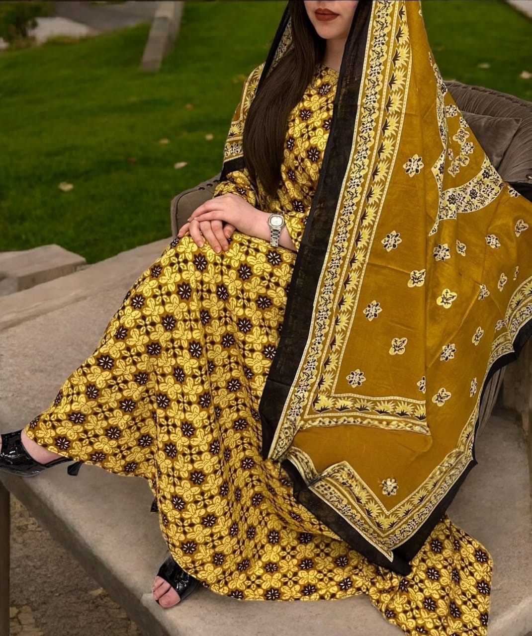 ثوب أصفر اللون مصنوع من القطن بتصميم جميل مطبوع عليه شيلة متناسقة مخيطة على الطراز الظفاري