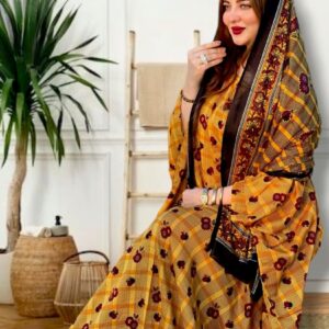 ثوب أصفر اللون مصنوع من القطن بتصميم جميل مطبوع عليه شيلة متناسقة مخيطة على الطراز الظفاري
