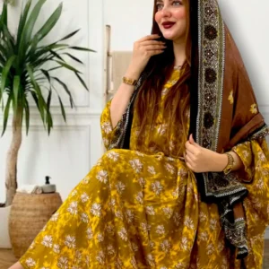 ثوب أصفر اللون مصنوع من القطن مع تصميم زهور جميل مطبوع مع شيله مطابقة مخيطة على طراز ظفري