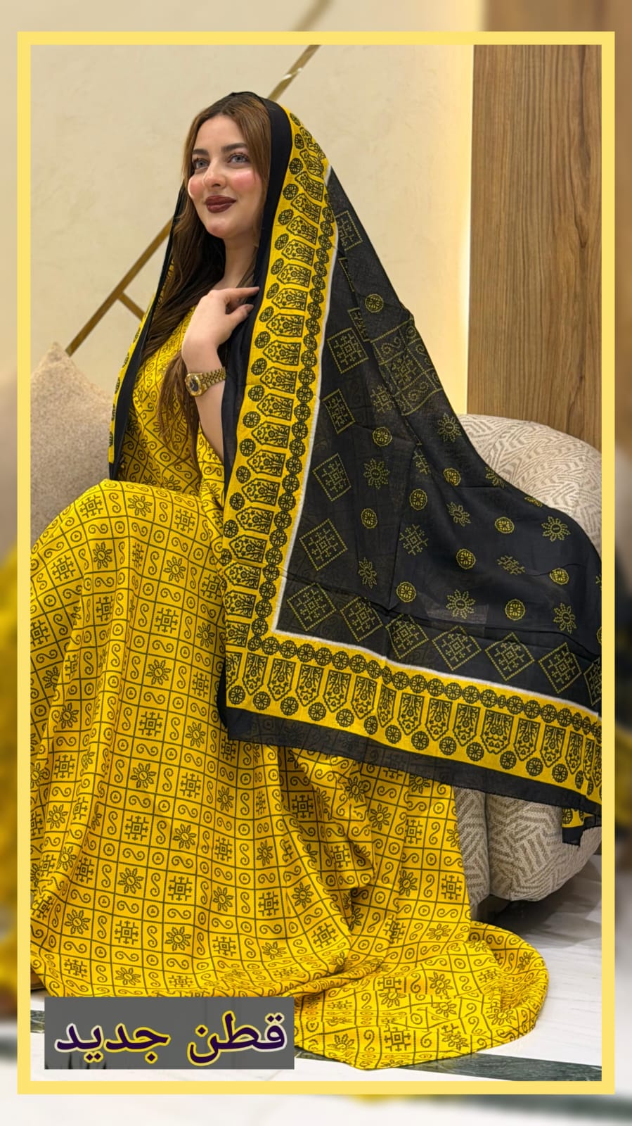 ثوب أصفر مصنوع من القطن بتصميم جميل مطبوع، مزود بشال متناسق مخيط على الطراز الظفاري