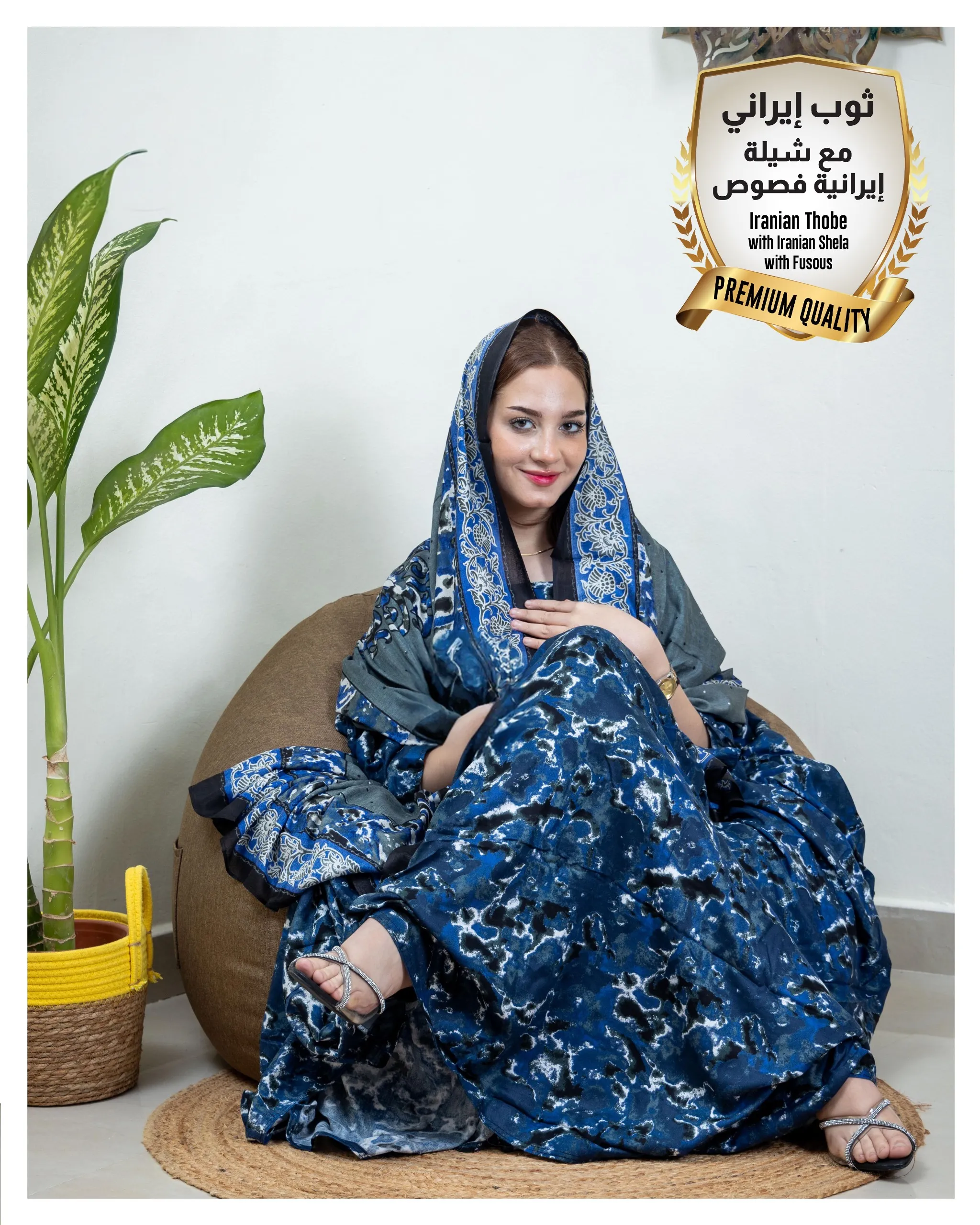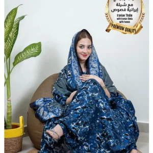 ثوب إيراني أزرق اللون مصنوع من القطن بتصميم جميل مطبوع بشيلة متناسقة مخيطة على الطراز الظفاري