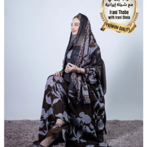 ثوب إيراني بني اللون مصنوع من القطن بتصميم جميل مطبوع بشيلة متناسقة مخيطة على طراز ظفاري