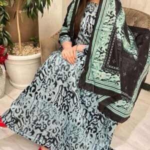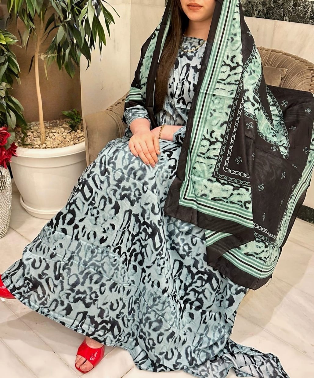 ثوب الأخضر البحري اللون مصنوع من القطن بتصميم جميل مطبوع بشيلة متناسقة ومخيطة على الطراز الظفاري