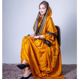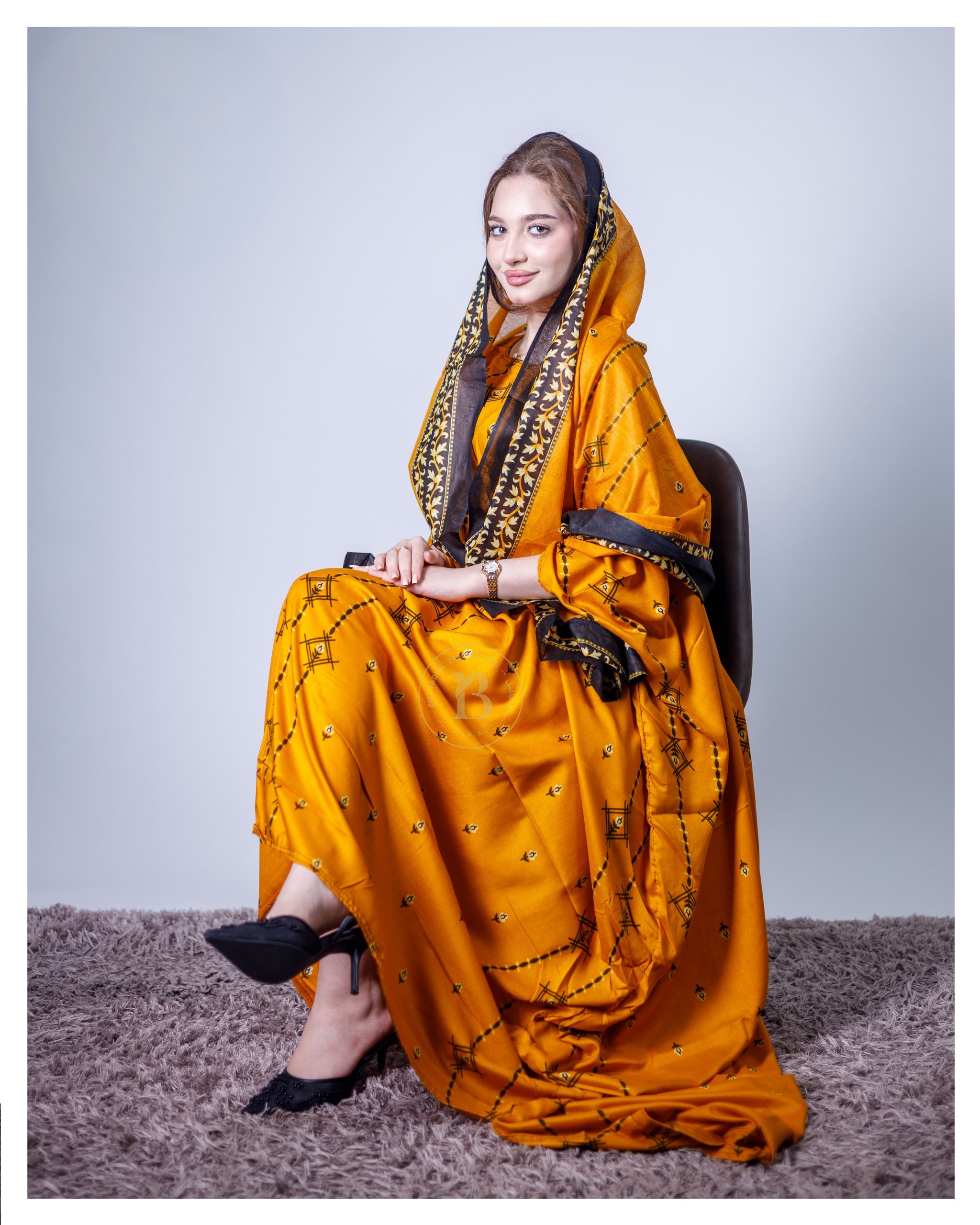 ثوب أصفر اللون مصنوع من القطن، مزين بتصميم جميل مطبوع عليه شيلة متناسقة، ومخيط على الطراز الظفاري
