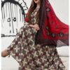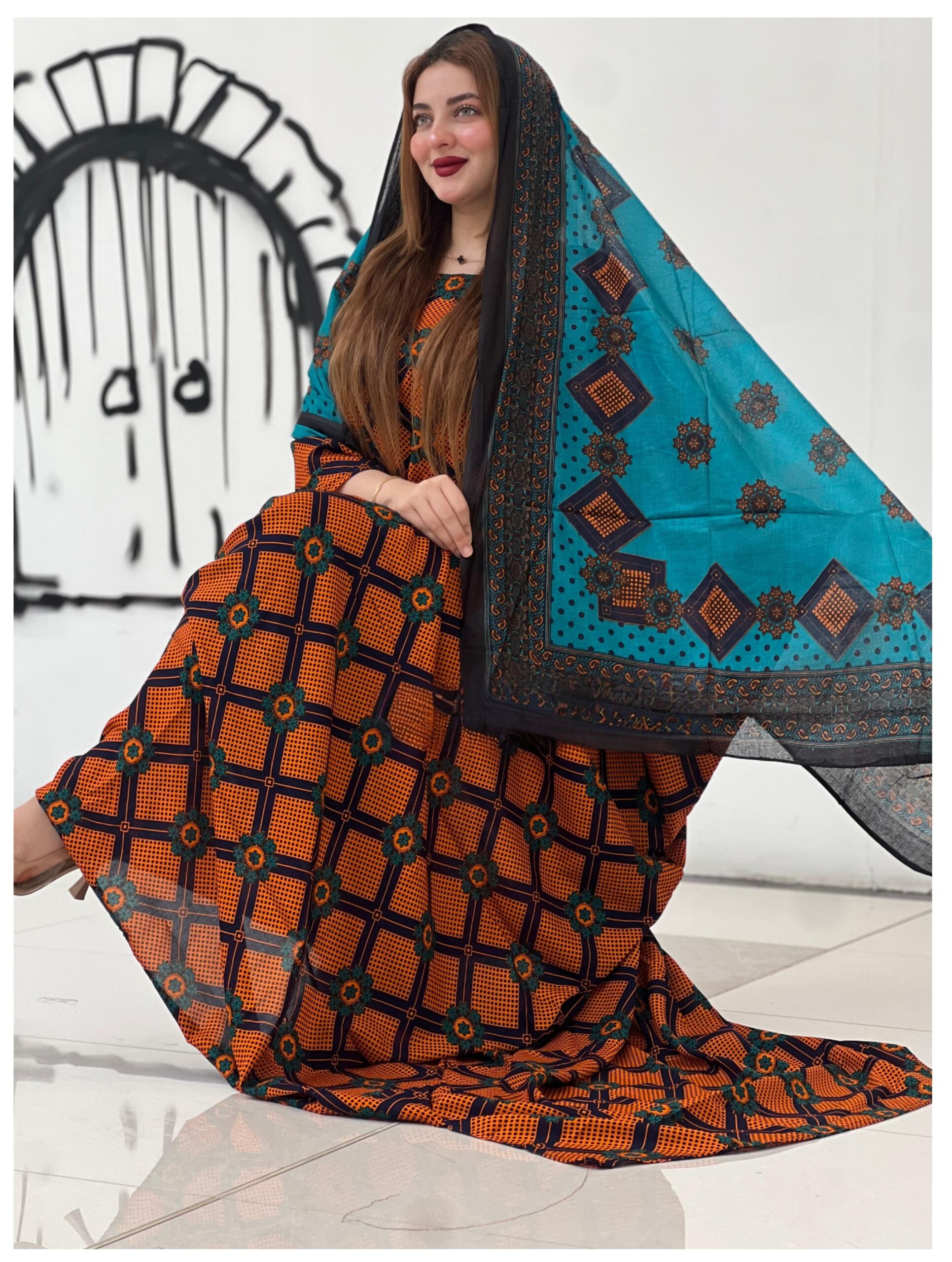 ثوب برتقالي اللون مصنوع من القطن بتصميم زهور جميلة مطبوع عليه شيلة متناسقة مخيطة على الطراز الظفاري