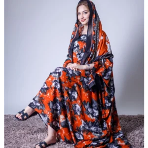 ثوب برتقالي اللون مصنوع من القطن بتصميم جميل مطبوع عليه شيلة متناسقة مخيطة على الطراز الظفري