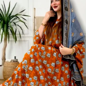 ثوب برتقالي اللون مصنوع من القطن مع تصميم زهور جميل مطبوع عليه وشيله مطابق مخيط على طراز ظفري