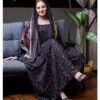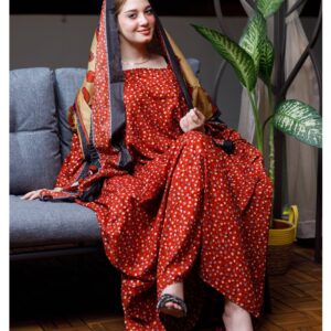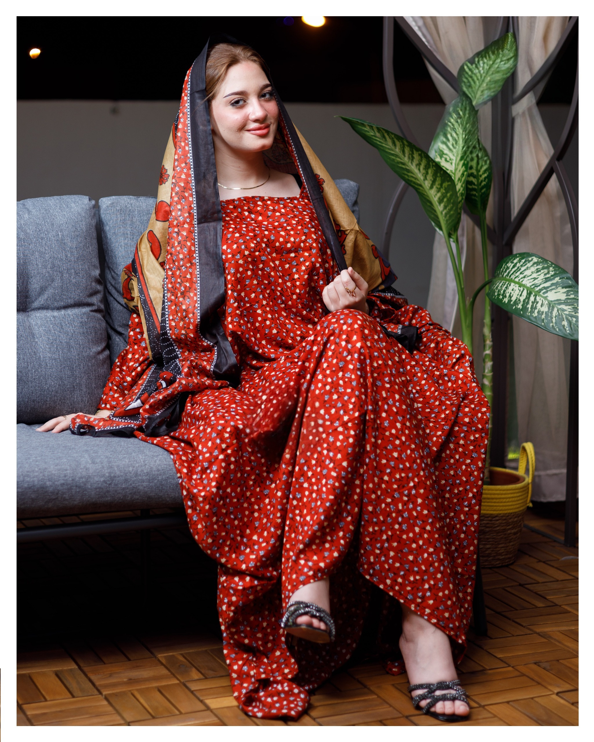 ثوب برتقالي اللون مصنوع من القطن مع تصميم زهور جميل مطبوع ومزين بشيلة متناسقة مخيطة على الطراز الظفاري