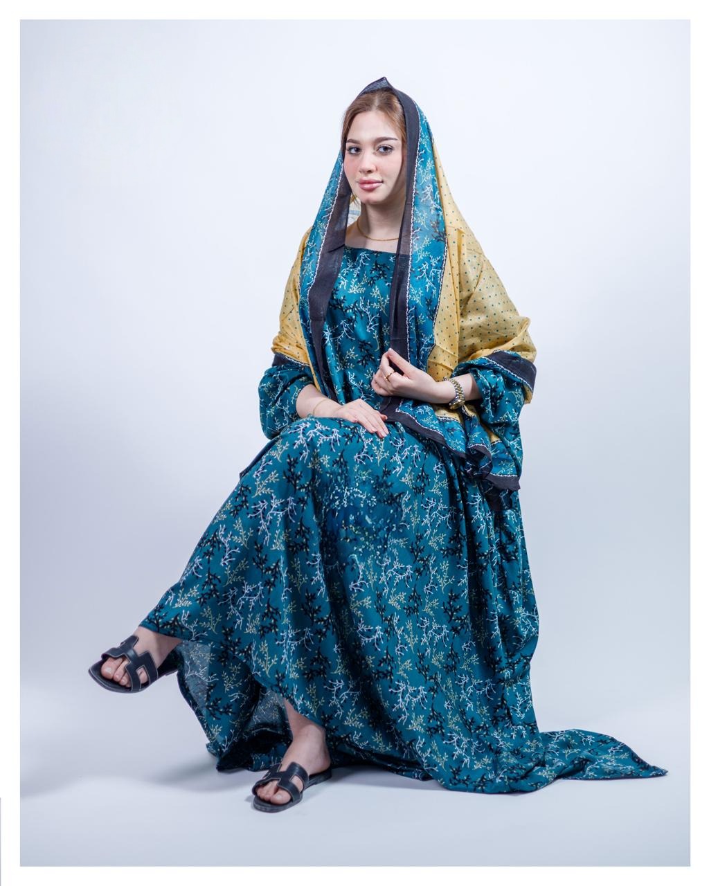 ثوب بلون أزرق بحري مصنوع من القطن بتصميم جميل مع شيلة مطابقة مخيطة على الطراز الظفاري