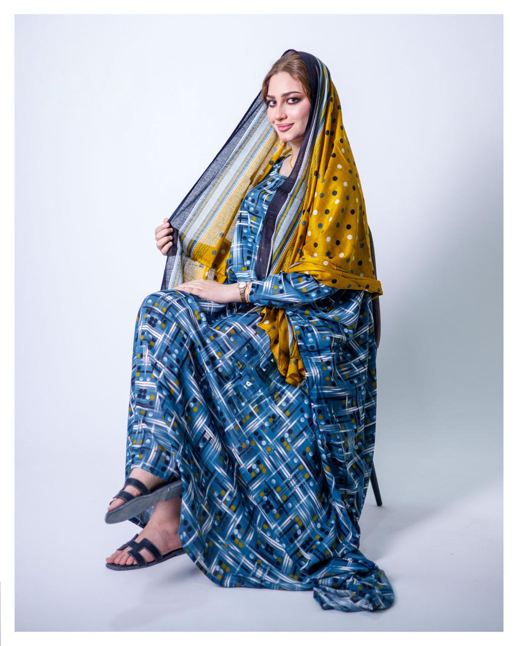 ثوب بلون أزرق سماوي مصنوع من القطن بتصميم جميل مطبوع عليه شيلة مطابقة مخيطة على طراز ظفاري
