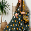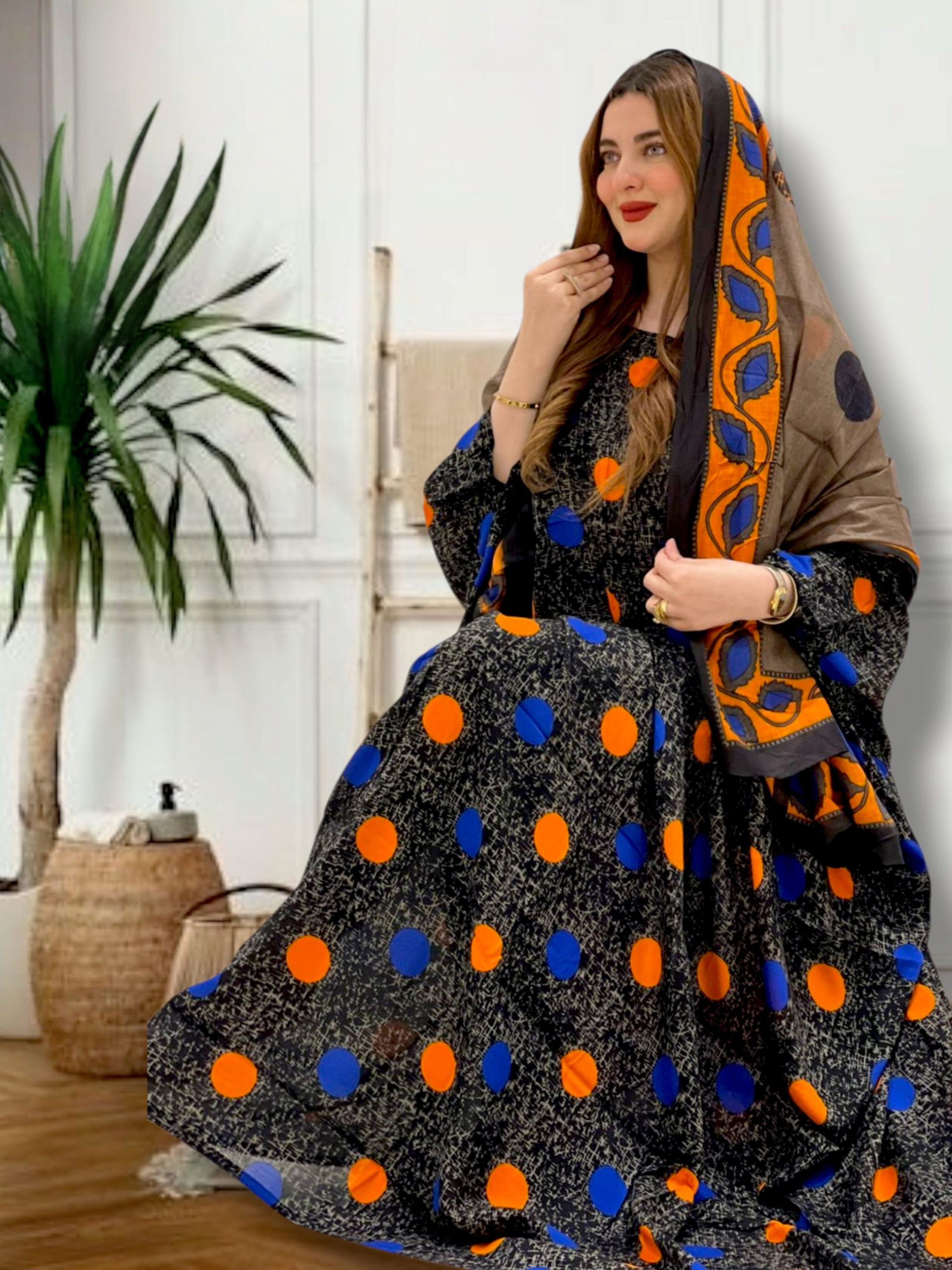 ثوب بلون أسود مصنوع من القطن بتصميم بولكا جميل مطبوع مع شيلة مطابقة مخيطة على طراز ظفاري