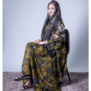 ثوب بلون أصفر فاتح مصنوع من القطن بتصميم جميل مطبوع عليه شيلة مطابقة مخيطة على طراز ظفاري