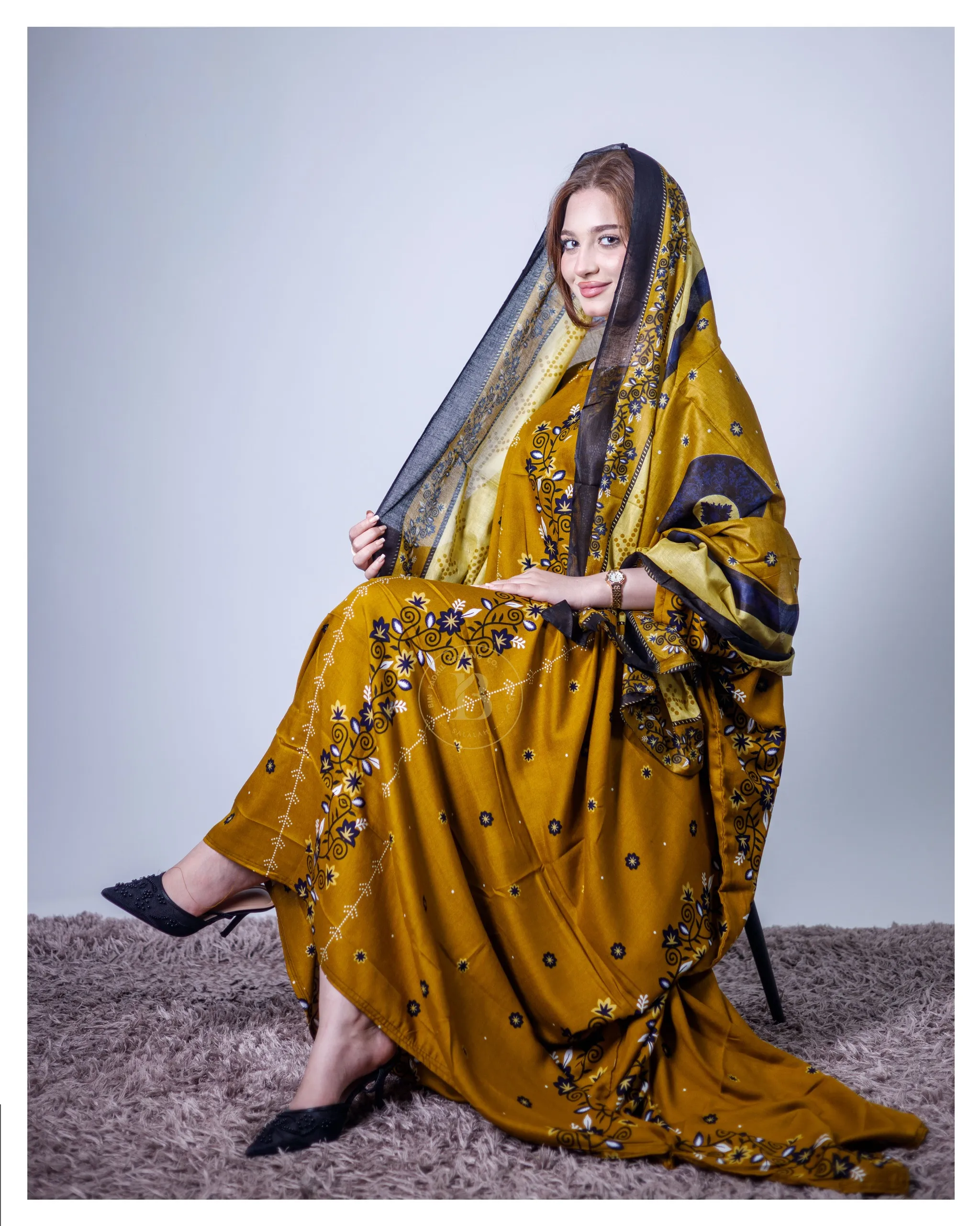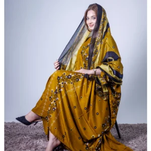 ثوب بلون الخردل مصنوع من القطن بتصميم جميل مطبوع بشيلة متناسقة ومخيطة على الطراز الظفاري