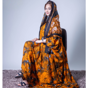 ثوب بلون برتقالي مصنوع من القطن بتصميم جميل مطبوع عليه شيلة متناسقة ومخيطة على الطراز الظفاري