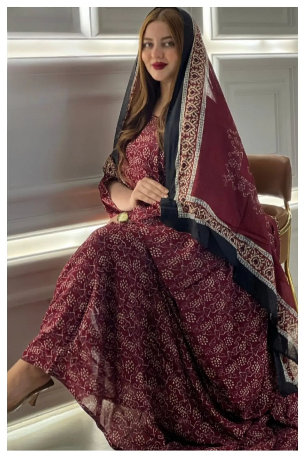 ثوب بلون مهرون مصنوع من القطن بتصميم جميل مطبوع بشيلة متناسقة ومخيطة على الطراز الظفاري