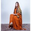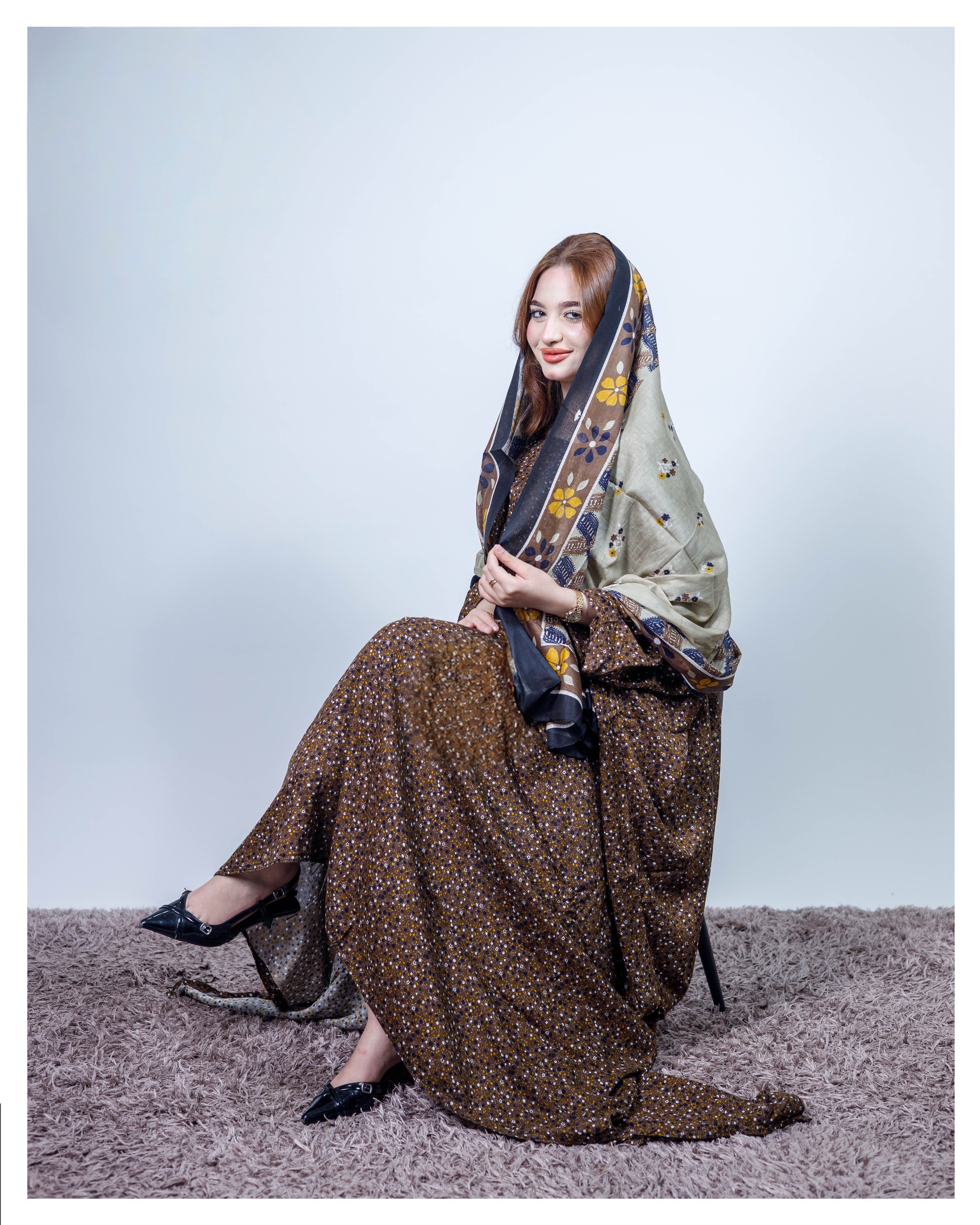 ثوب بني اللون مصنوع من القطن بتصميم جميل مطبوع عليه شيلة متناسقة مخيطة على الطراز الظفاري