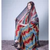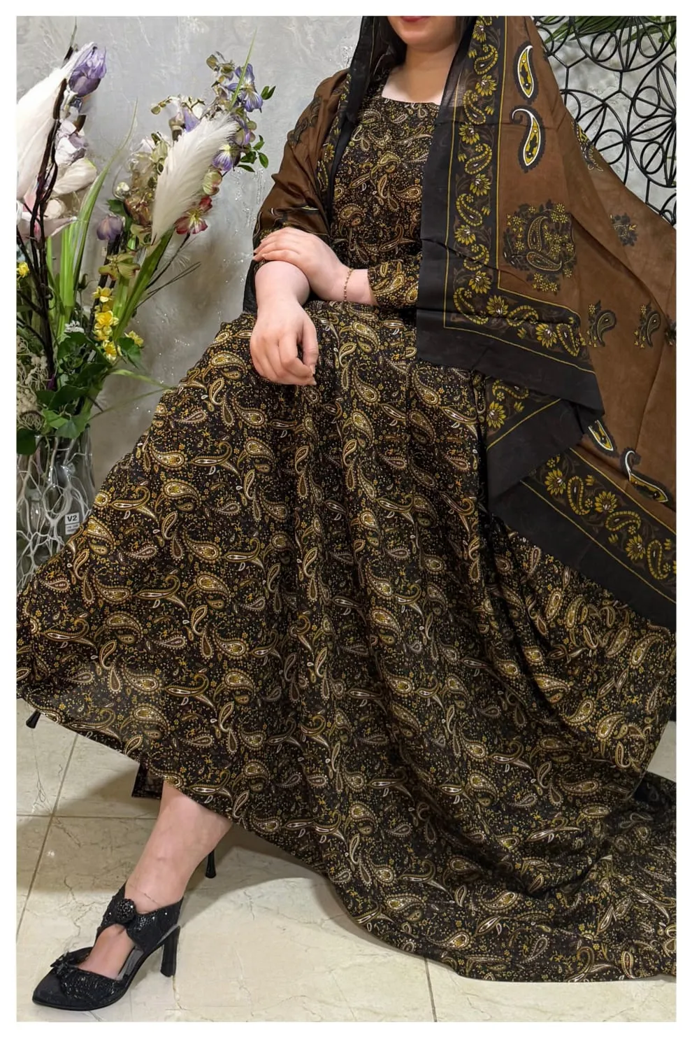 ثوب بني اللون مصنوع من القطن بتصميم جميل مطبوع عليه شيلة متناسقة مخيطة على الطراز الظفاري